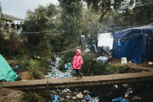 A young asylum-seeking girl from Afghanistan walks on a makeshift bridge inside what is known as the Olive Grove, an improvised camp adjacent to the Moria Reception and Identification centre on the Greek island of Lesvos. © UNHCR/Achilleas Zavallis